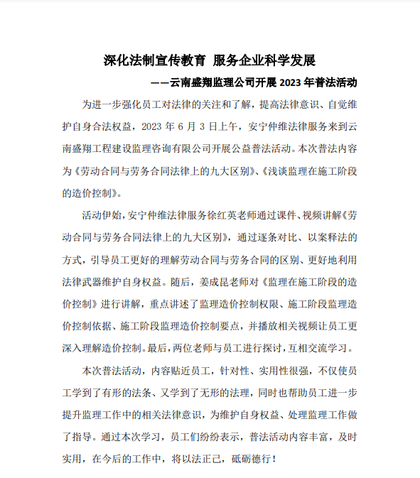 深化法制宣傳教育 服務(wù)企業(yè)科學(xué)發(fā)展 ——云南盛翔監(jiān)理公司開展2023年普法活動(dòng)