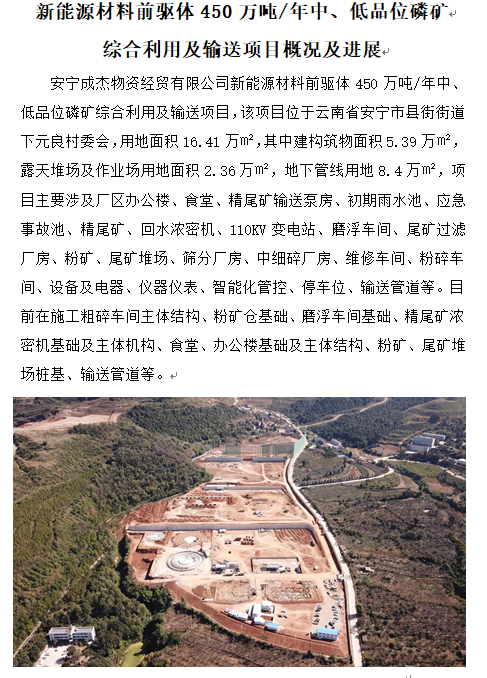 新能源材料前驅(qū)體450萬噸/年中、低品位磷礦綜合利用及輸送項(xiàng)目概況及進(jìn)展