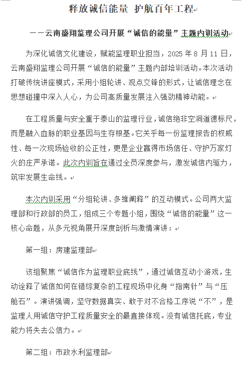 釋放誠信能量 護航百年工程 ——云南盛翔監(jiān)理公司開展“誠信的能量”主題內訓活動