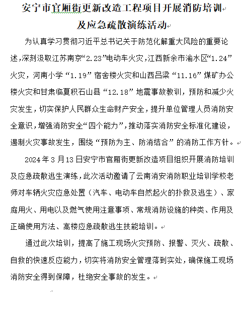 安寧市官廂街更新改造工程項(xiàng)目開展消防培訓(xùn)及應(yīng)急疏散演練活動(dòng)