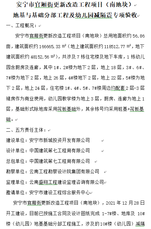 安寧市官廂街更新改造工程項(xiàng)目(南地塊) 地基與基礎(chǔ)分部工程及幼兒園減隔震專項(xiàng)驗(yàn)收
