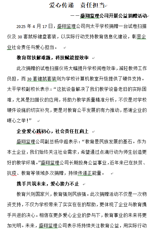 愛心傳遞 責(zé)任擔(dān)當(dāng) ——盛翔監(jiān)理公司開展公益捐贈活動