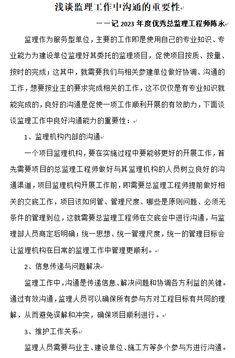 淺談監(jiān)理工作中溝通的重要性 ——記2023年度優(yōu)秀總監(jiān)理工程師陳永