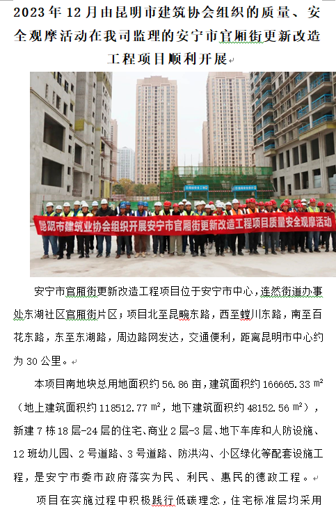 2023年12月由昆明市建筑協(xié)會組織的質量、安全觀摩活動在我司監(jiān)理的安寧市官廂街更新改造工程項目順利開展