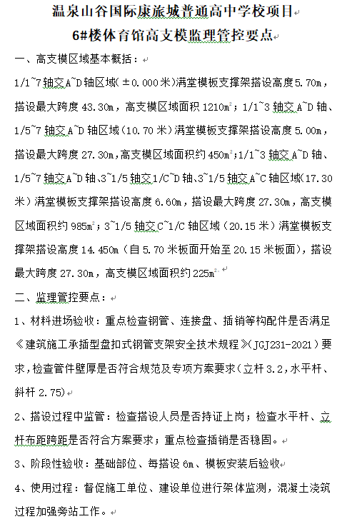 溫泉山谷國際康旅城普通高中學(xué)校項(xiàng)目 6#樓體育館高支模監(jiān)理管控要點(diǎn)