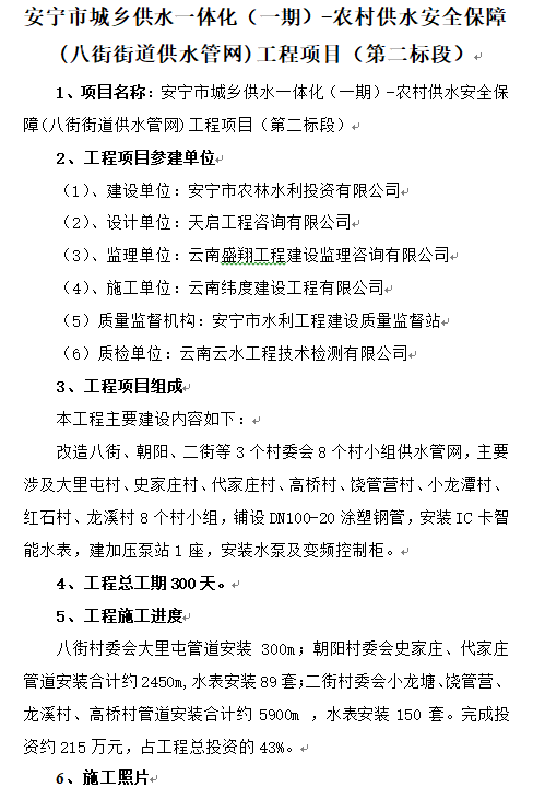 安寧市城鄉(xiāng)供水一體化(一期)-農(nóng)村供水安全保障(八街街道供水管網(wǎng))工程項(xiàng)目(第二標(biāo)段)