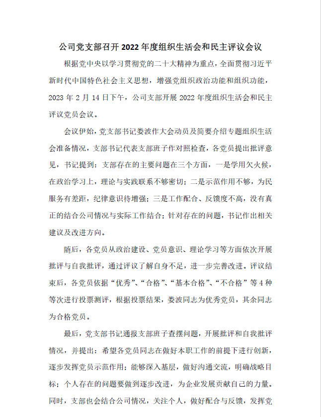 公司黨支部召開2022年度組織生活會(huì)和民主評(píng)議會(huì)議