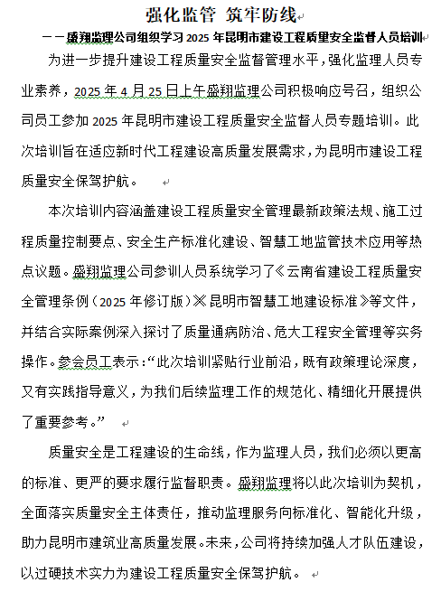 強化監(jiān)管 筑牢防線 ——盛翔監(jiān)理公司組織學(xué)習(xí)2025年昆明市建設(shè)工程質(zhì)量安全監(jiān)督人員培訓(xùn)