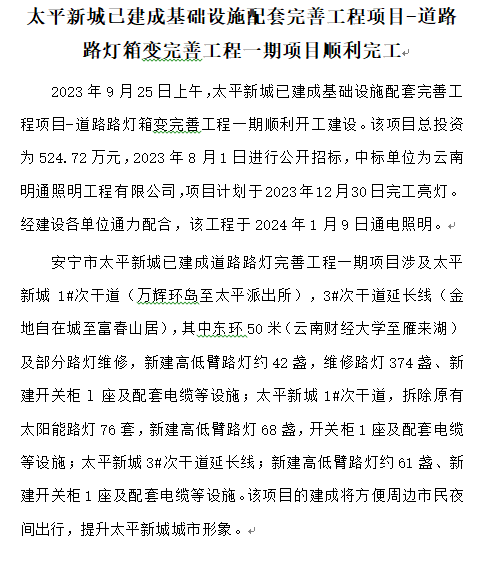 太平新城已建成基礎(chǔ)設(shè)施配套完善工程項(xiàng)目-道路路燈箱變完善工程一期項(xiàng)目順利完工