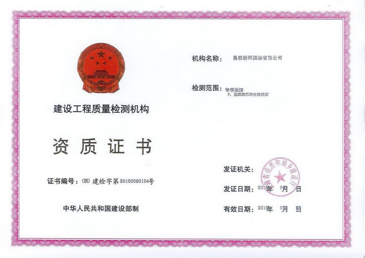 公司2005年5月取得云南省測繪局丙級資質,2014年4月取得國家乙級測繪資質證書,證號:乙測資字53100014號,2016年6月取得云南住房和城鄉(xiāng)建設廳:建設工程質量檢測資質證書,證號:建檢字第20150090104號,公司經營范圍:地理信息系統工程、工程測量、不動產測繪(房產測繪、地籍測繪)、工程檢測。