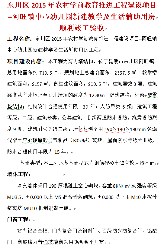 東川區(qū)2015年農(nóng)村學前教育推進工程建設項目--阿旺鎮(zhèn)中心幼兒園新建教學及生活輔助用房 順利竣工驗收