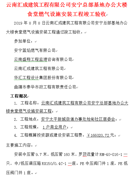 云南匯成建筑工程有限公司安寧總部基地辦公大樓食堂燃氣設(shè)施安裝工程竣工驗收
