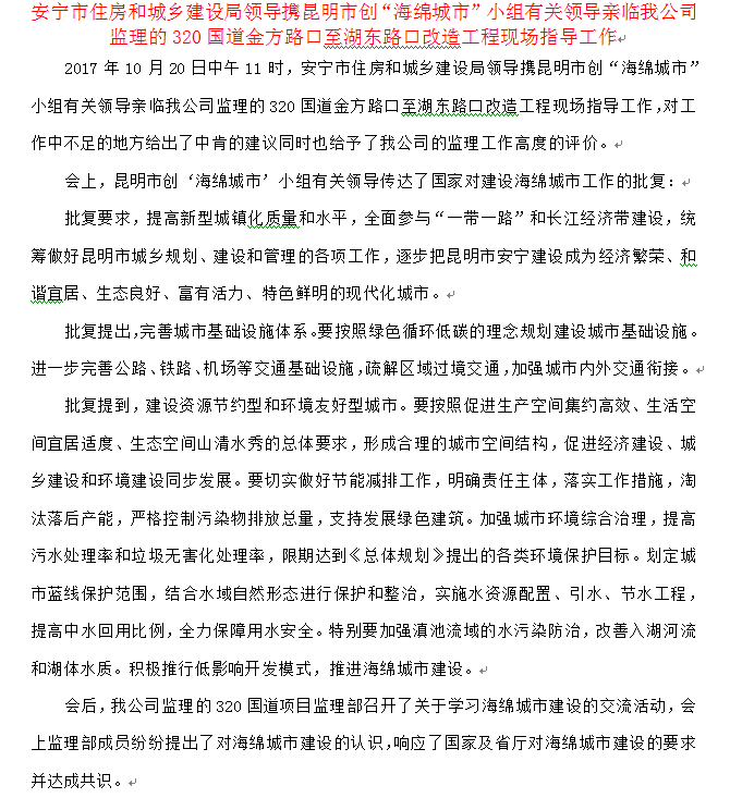 安寧市住房和城鄉(xiāng)建設局領導攜昆明市創(chuàng)“海綿城市”小組有關(guān)領導親臨我公司監(jiān)理的320國道金方路口至湖東路口改造工程現(xiàn)場指導工作