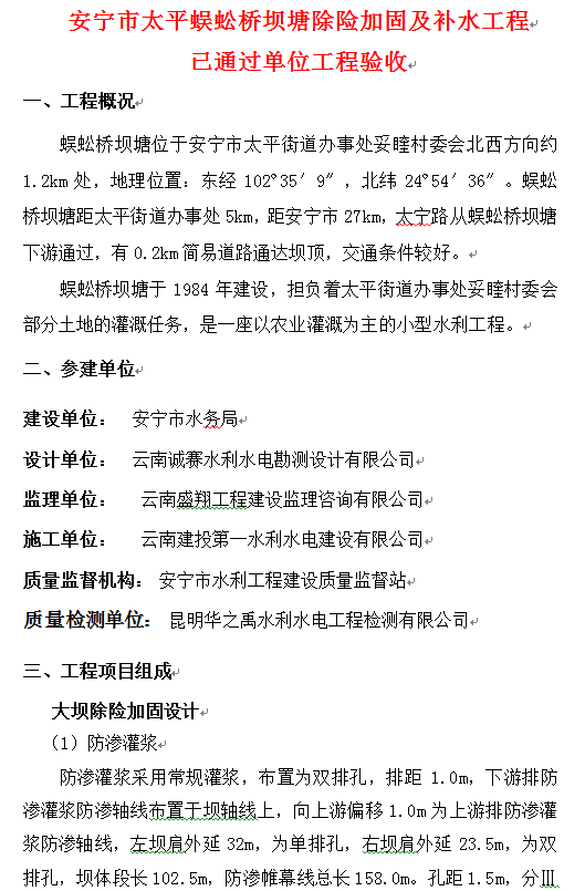 安寧市太平蜈蚣橋壩塘除險(xiǎn)加固及補(bǔ)水工程 已通過單位工程驗(yàn)收