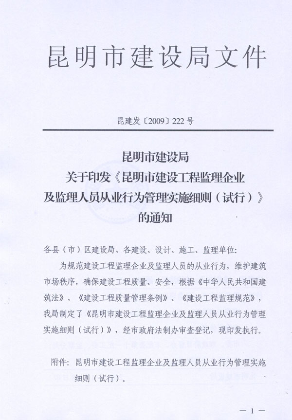 昆明市建設(shè)局關(guān)于印發(fā)《昆明市建設(shè)工程監(jiān)理企業(yè)及監(jiān)理人員從業(yè)行為管理實(shí)施細(xì)則(試行)》的通知