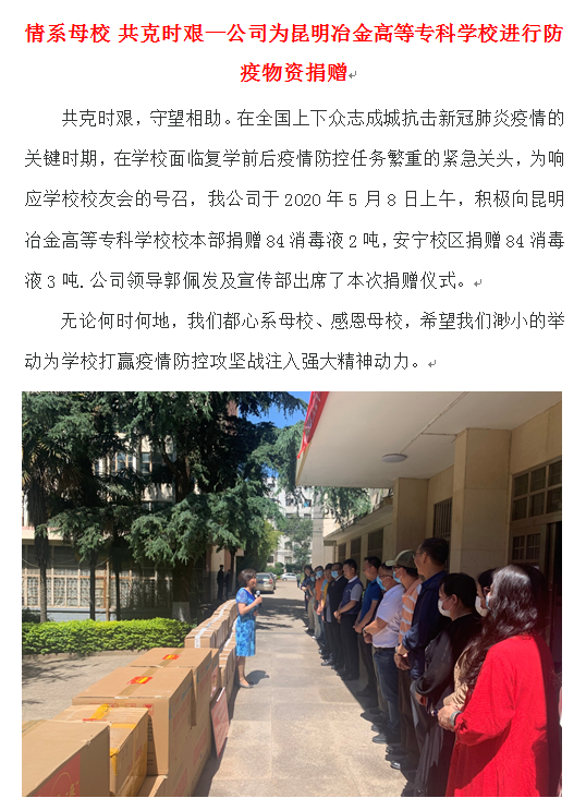 • 情系母校 共克時(shí)艱—公司為昆明冶金高等??茖W(xué)校進(jìn)行防疫物資捐贈(zèng)
