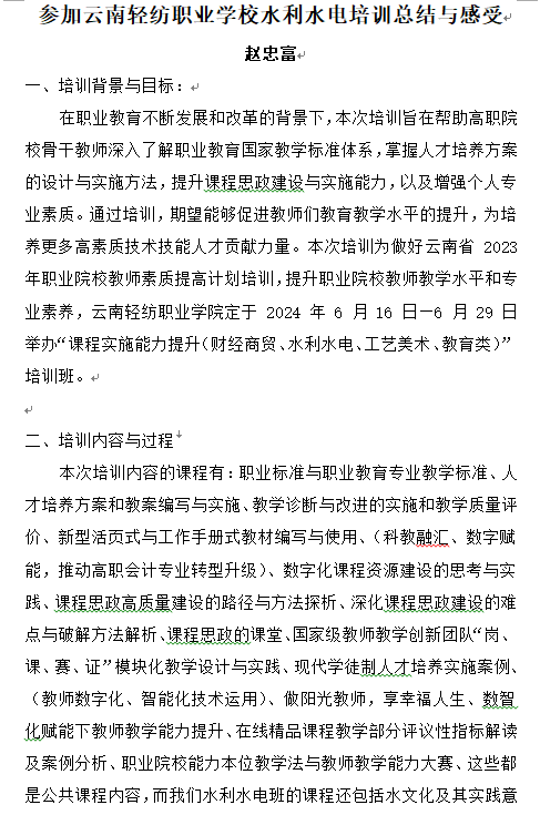 參加云南輕紡職業(yè)學(xué)校水利水電培訓(xùn)總結(jié)與感受——趙忠富