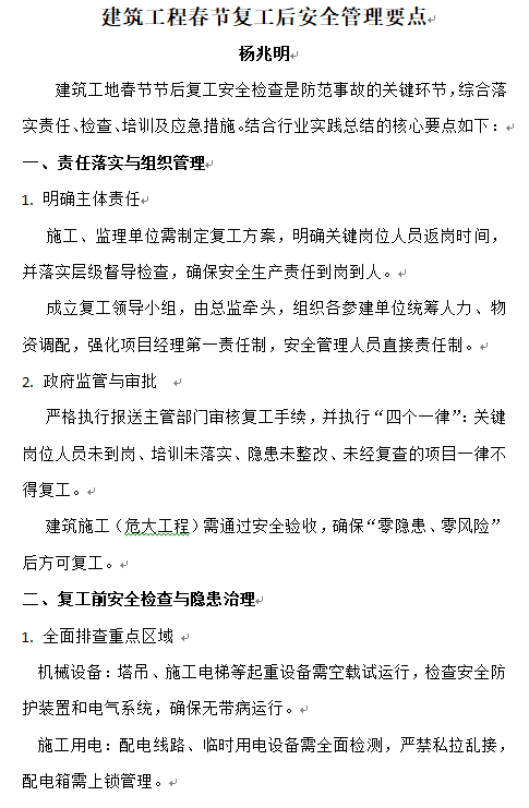 建筑工程春節(jié)復工后安全管理要點——楊兆明