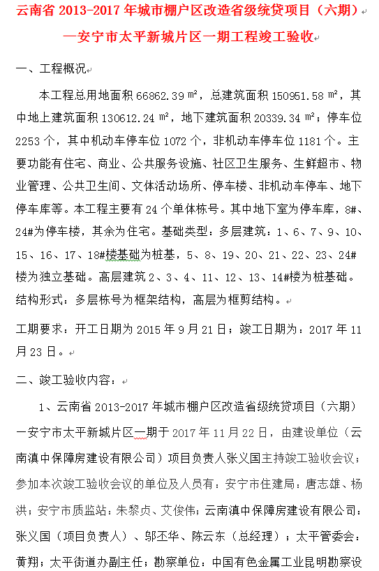 云南省2013-2017年城市棚戶區(qū)改造省級統(tǒng)貸項(xiàng)目(六期) —安寧市太平新城片區(qū)一期工程竣工驗(yàn)收
