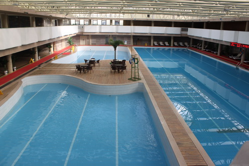 3.水療中心外裝修:外墻涂料。室內(nèi)裝修:地面:地磚。墻面:墻磚、乳膠漆。強(qiáng)化木地板。頂棚:衛(wèi)生間防水石膏吊頂,其余普通石膏吊頂刷乳膠漆。門窗:門為防火門、實(shí)木門、玻璃門。屋面露臺(tái)二道丙綸卷材防水后做砂漿保護(hù)層。游泳池頂翻新為陽(yáng)光板和金屬保溫板屋面。沐浴間、衛(wèi)生間做二道防水??紤]使用要求原來(lái)室外部分改造成鋼結(jié)構(gòu)服務(wù)大廳,正立面玻璃幕墻飾面。