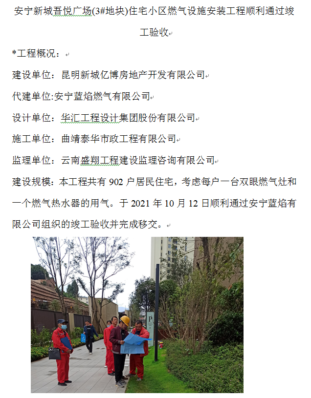 安寧新城吾悅廣場(chǎng)(3#地塊)住宅小區(qū)燃?xì)庠O(shè)施安裝工程順利通過(guò)竣工驗(yàn)收