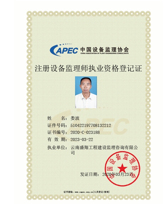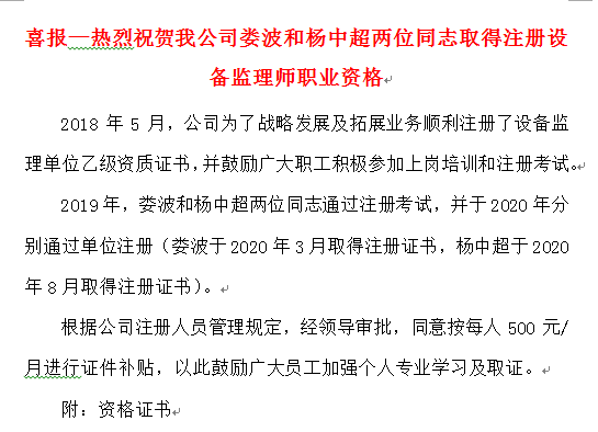 喜報(bào)—熱烈祝賀我公司婁波和楊中超兩位同志取得注冊設(shè)備監(jiān)理師職業(yè)資格