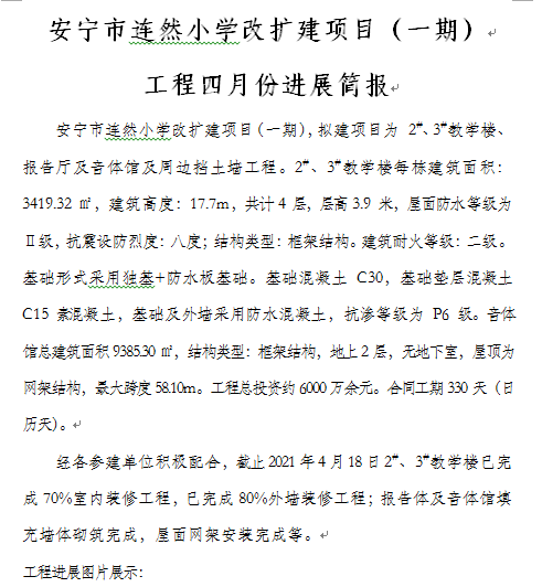安寧市連然小學(xué)改擴建項目(一期) 工程四月份進展簡報