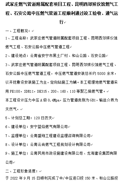 武家莊燃?xì)夤艿栏綄倥涮醉?xiàng)目工程、昆明西郊?xì)泝x館燃?xì)夤こ?、石安公路中壓燃?xì)夤艿拦こ添樌ㄟ^竣工驗(yàn)收、通氣運(yùn)行