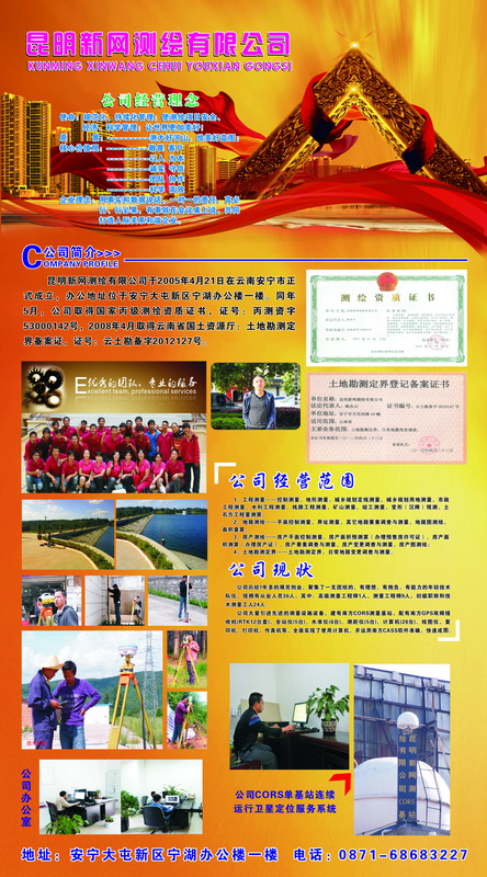 幾年來,我公司力求“以質(zhì)量求生存,以信譽(yù)求發(fā)展”的宗旨服務(wù)于社會,在社會各屆的大力支持和廣大工程技術(shù)人員的辛勤工作下,測繪項(xiàng)目遍及云南省各地區(qū),為云南省地方建設(shè)做出了積極的貢獻(xiàn)。在今后的工作中,公司依靠“信守合同、科技領(lǐng)先”的經(jīng)營理念,不斷提高測繪水平,以一流的測繪成果服務(wù)客戶,以一流的測繪業(yè)績奉獻(xiàn)社會。