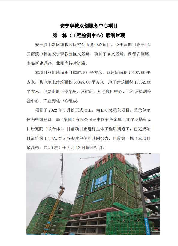 安寧職教雙創(chuàng)服務(wù)中心項(xiàng)目 第一棟(工程檢測(cè)中心)順利封頂