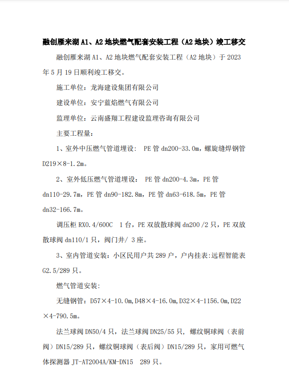 融創(chuàng)雁來湖A1、A2地塊燃?xì)馀涮装惭b工程(A2地塊)竣工移交